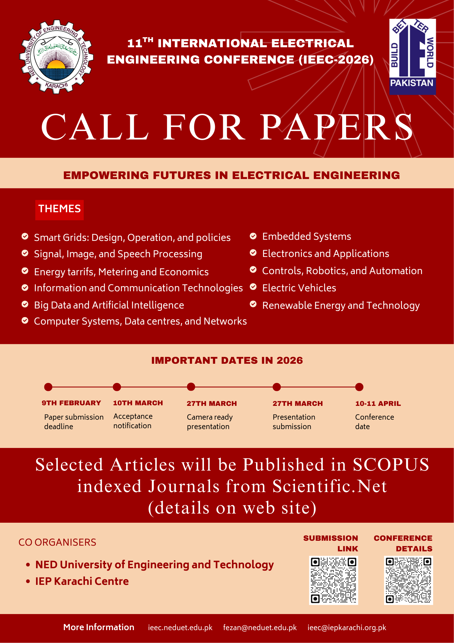 The Department of Electrical Engineering at NED University of Engineering and Technology, Karachi, in collaboration with the Institute of Engineers Pakistan (IEP), proudly presents the 11th edition of the International Electrical Engineering Conference (IEEC 2026), scheduled to be held on Friday 10th and Saturday 11th April, 2026. Since its inception in 2016, IEEC has grown into a premier platform for researchers, academicians, industry professionals, and students to exchange knowledge, present innovative research, and explore the future of electrical engineering.